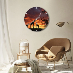 - Silhouettes de girafes sur fond de coucher de soleil africain spectaculaire. Une horloge murale unique qui apporte harmonie et exotisme à tout intérieur.
