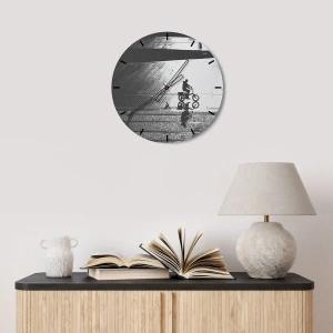 « En avant, à travers la ville » est une horloge murale moderne au design minimaliste et élégant, dont le motif principal est une photographie en noir et blanc d'un cycliste et de son reflet dans une flaque. Le jeu d'ombre et de lumière crée une composition extrêmement efficace, soulignant le contraste et la dynamique de l'image. Cette combinaison harmonieuse d'atmosphère urbaine et d'expression artistique fait de cette horloge un élément décoratif unique.