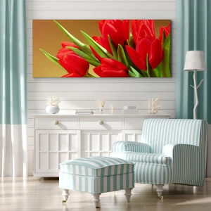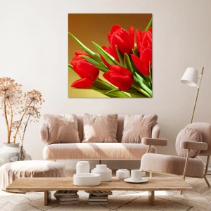 Impression sur toile - Image sur toile - Un bouquet de tulipes rouges sur fond doré avec des feuilles vertes. - 50x70cm - Amas de joie printanière - Décoration murale moderne pour le salon et la chambre ARTTOR