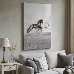 Impression sur toile - Image sur toile - Deux chevaux au galop dans une composition dynamique en noir et blanc - 50x70cm - Anges et démons - Décoration murale moderne pour le salon et la chambre ARTTOR
