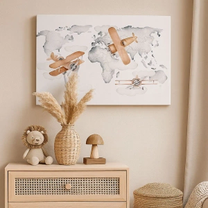• Carte du monde, avions, enfants, Pour enfants, Cartes du monde, Avions, Vintage et rétro, Pour la chambre des enfants Blanc, marron, gris, Verticale