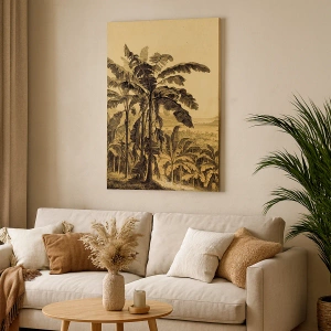 Impression sur toile - Image sur toile - Dessin de bananiers sur fond de paysage tropical - 50x70cm - Dans un climat colonial - Décoration murale moderne pour le salon et la chambre ARTTOR