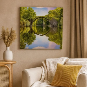 Impression sur toile - Image sur toile - Un pont de pierre sur une rivière avec un reflet parfait dans l'eau - 100x70cm - À la jonction de deux mondes - Décoration murale moderne pour le salon et la chambre ARTTOR