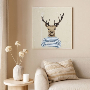 - Ce tableau représente un cerf en t-shirt rayé sur un fond clair et délicatement texturé. Idéal pour les amateurs d'art humoristique au style moderne.