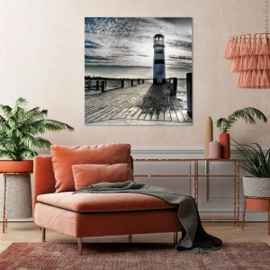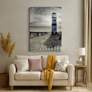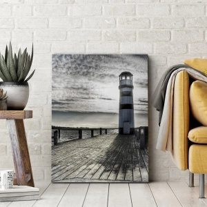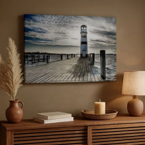Impression sur toile - Image sur toile - Phare sur une jetée en bois surplombant la mer. - 50x70cm - Marins, je vous attend - Décoration murale moderne pour le salon et la chambre ARTTOR