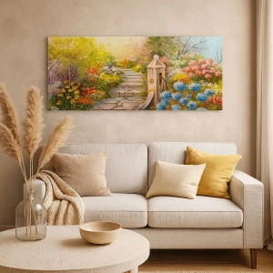 Impression sur toile - Image sur toile - Un jardin pittoresque avec une fontaine et des fleurs colorées - 50x70cm - En pleine floraison - Décoration murale moderne pour le salon et la chambre ARTTOR