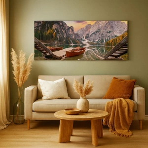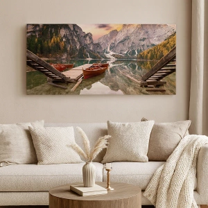 Impression sur toile - Image sur toile - Lac de montagne avec bateaux au coucher du soleil - 50x70cm - Promesse du jour - Décoration murale moderne pour le salon et la chambre ARTTOR