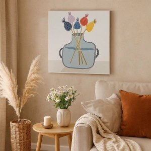 - Un tableau subtil représentant des fleurs séchées colorées dans un vase sur fond blanc. Idéal pour les amateurs de simplicité et de décoration naturelle, il apporte harmonie et style à tout intérieur.