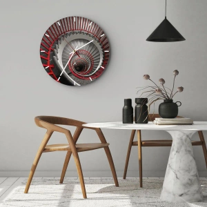 - Cette horloge murale ronde de 30 x 30 cm présente un effet d'escalier en colimaçon vu du dessus. Les rampes rouges contrastent avec l'espace gris, créant une composition moderne et dynamique. Ce produit est signé ARTTOR.