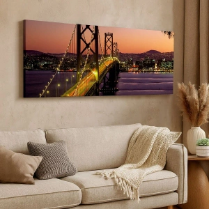 • Un tableau représentant un pont suspendu illuminé au-dessus de l'eau au crépuscule, surplombant la ville. Le soleil couchant et l'éclairage créent une atmosphère tamisée.