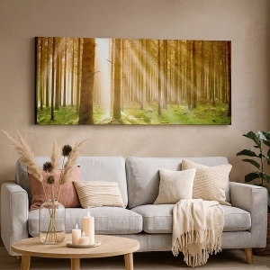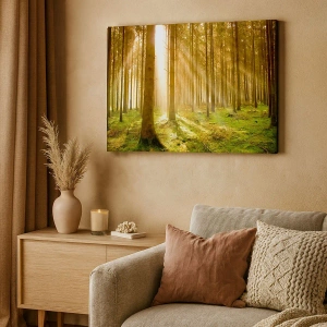 Impression sur toile - Image sur toile - Forêt de conifères avec les rayons du soleil qui brillent à travers les arbres - 120x80cm - Les elfes vont bientôt apparaître - Décoration murale moderne pour le salon et la chambre ARTTOR