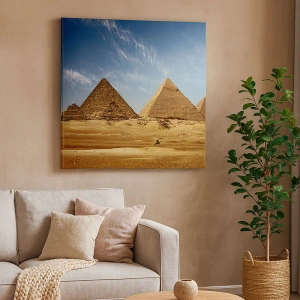 Impression sur toile - Image sur toile - Les pyramides de Gizeh contre un ciel bleu et un paysage désertique - 100x70cm - 40 siècles vous regardent - Décoration murale moderne pour le salon et la chambre ARTTOR