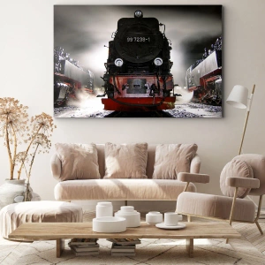 - Une locomotive à vapeur historique baignée de vapeur dans un décor nocturne atmosphérique. Un tableau chargé d'histoire, de mécanique et d'élégance, parfait pour les intérieurs industriels et classiques.