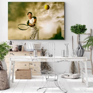 Impression sur toile - Image sur toile - Joueur de tennis en action lors d'un match avec en toile de fond un paysage urbain - 120x50cm - Énergie et joie - Décoration murale moderne pour le salon et la chambre ARTTOR