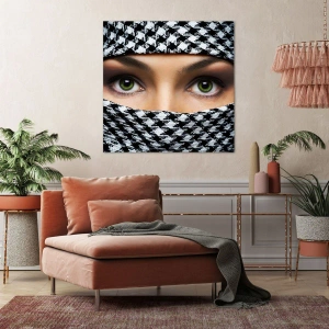 Impression sur toile - Image sur toile - Les yeux verts d'une femme sont cachés derrière un tissu à motifs en noir et blanc. - 120x80cm - Un portrait d'une beauté voilée aux yeux verts - Décoration murale moderne pour le salon et la chambre ARTTOR