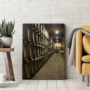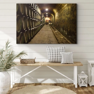 Impression sur toile - Image sur toile - Une cave avec des tonneaux de vin en bois disposés en rangées - 120x50cm - Qu'il est bon de s'allonger - Décoration murale moderne pour le salon et la chambre ARTTOR