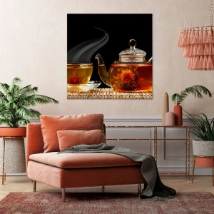 Impression sur toile - Image sur toile - Théière en verre avec thé aux fleurs et une tasse - 120x80cm - La magie et l'art de l'infusion du thé - Décoration murale moderne pour le salon et la chambre ARTTOR