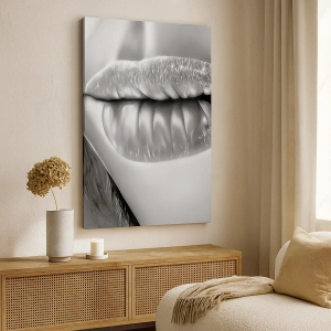 Impression sur toile - Image sur toile - Gros plan noir et blanc des lèvres d'une femme avec un effet brillant et des détails. - 160x50cm - Je sais à quoi tu penses… - Décoration murale moderne pour le salon et la chambre ARTTOR