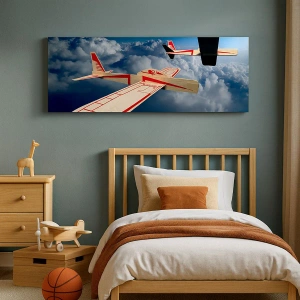 Impression sur toile - Image sur toile - Deux avions en bois planant au-dessus des nuages contre un ciel bleu. - 120x50cm - Encore plus haut, encore plus loin - Décoration murale moderne pour le salon et la chambre ARTTOR