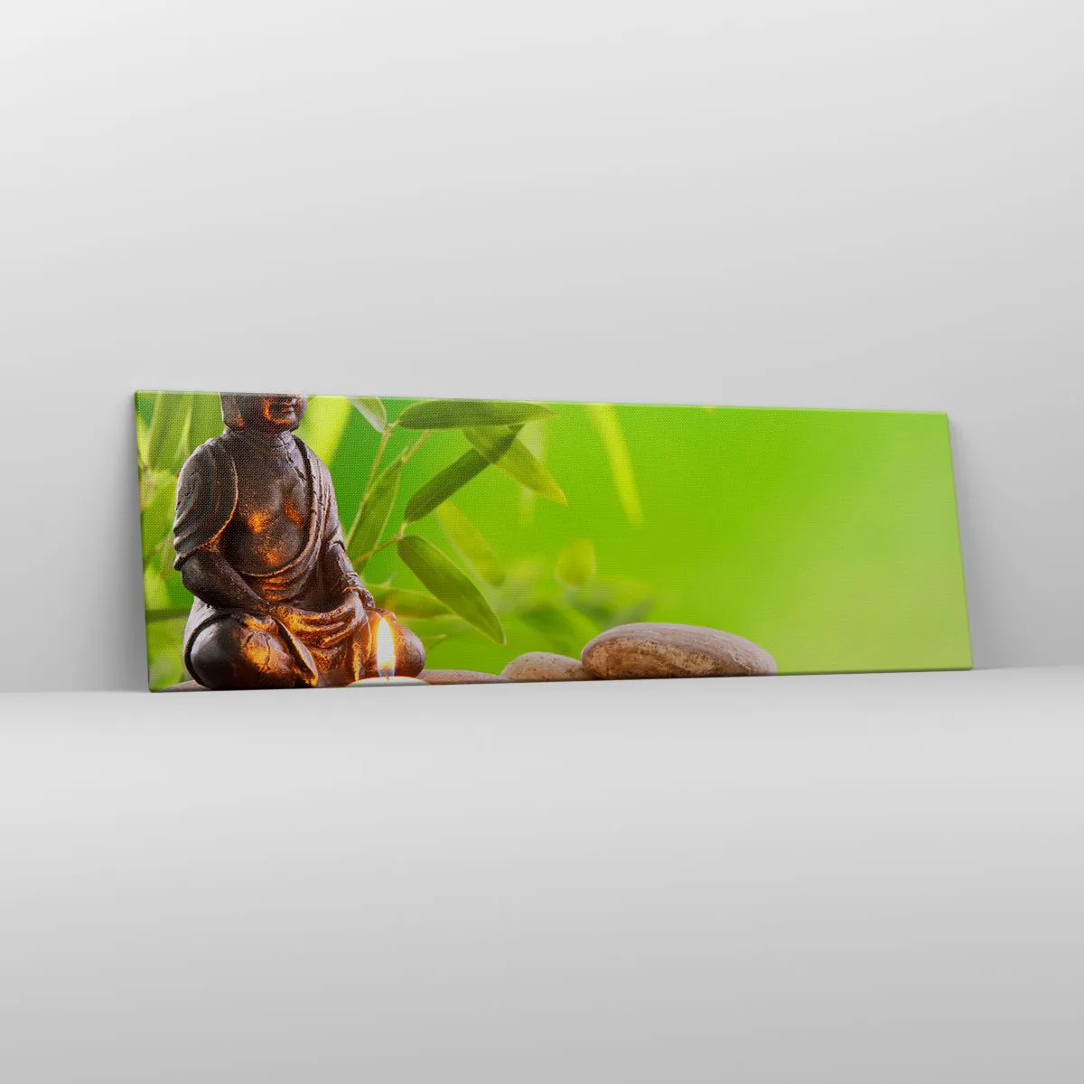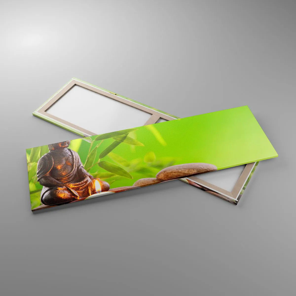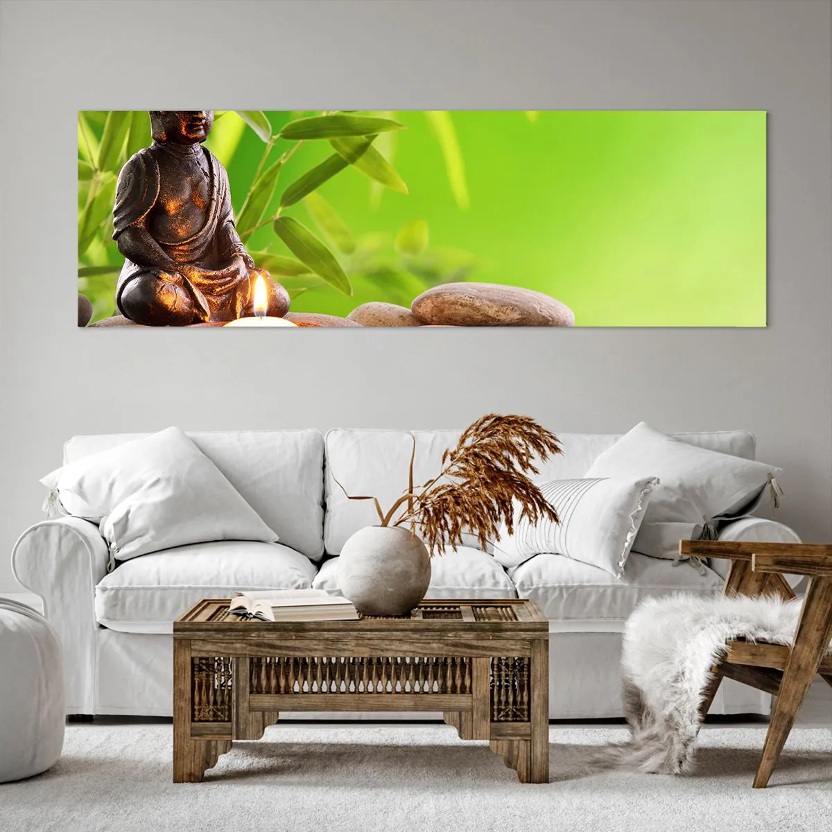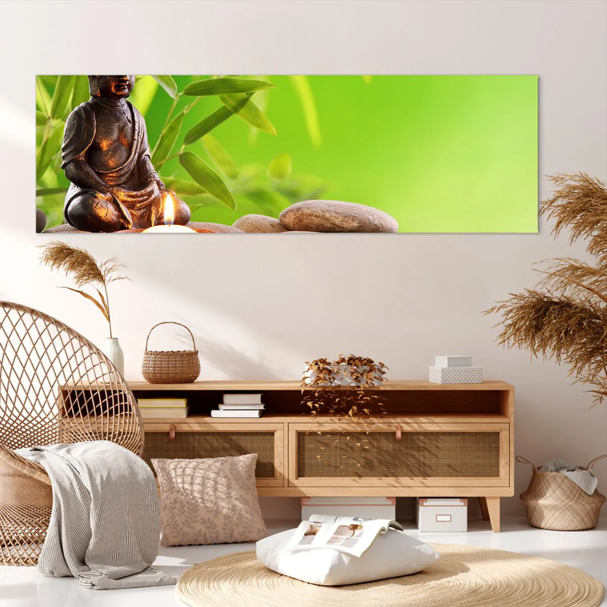 Impression sur toile - Image sur toile - Figure de Bouddha avec des pierres et une bougie sur un fond de bambou - 160x50cm - La vie est belle - Décoration murale moderne pour le salon et la chambre ARTTOR