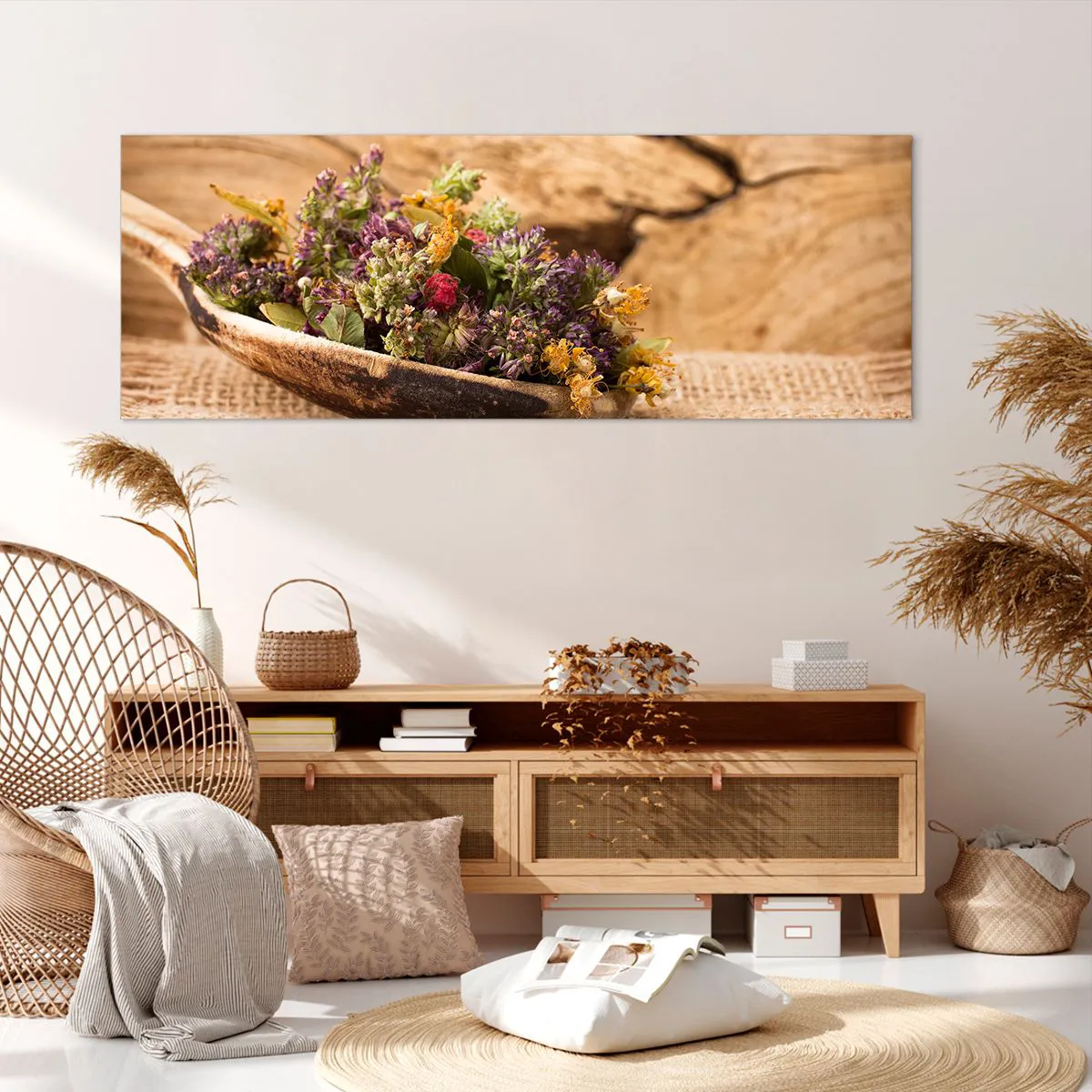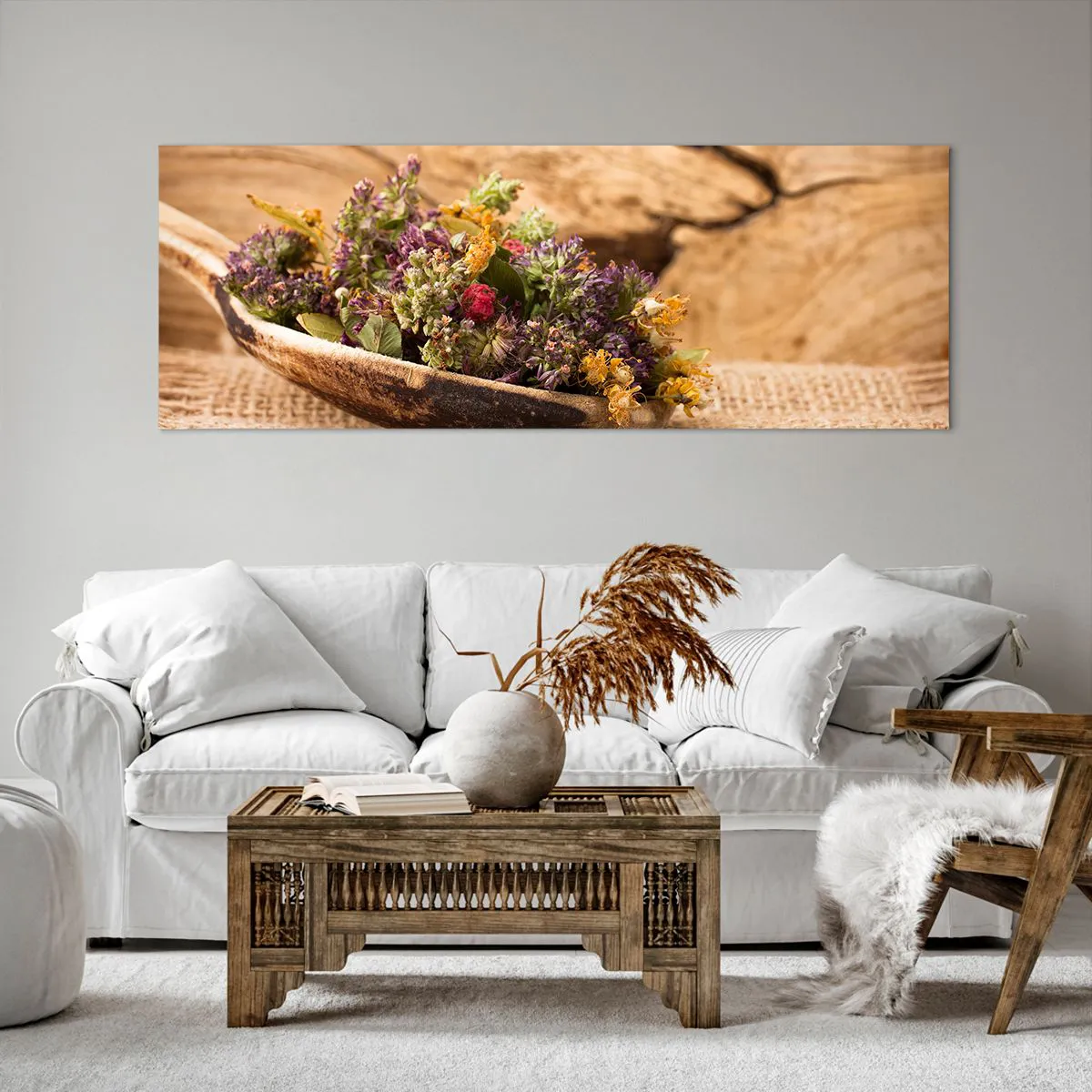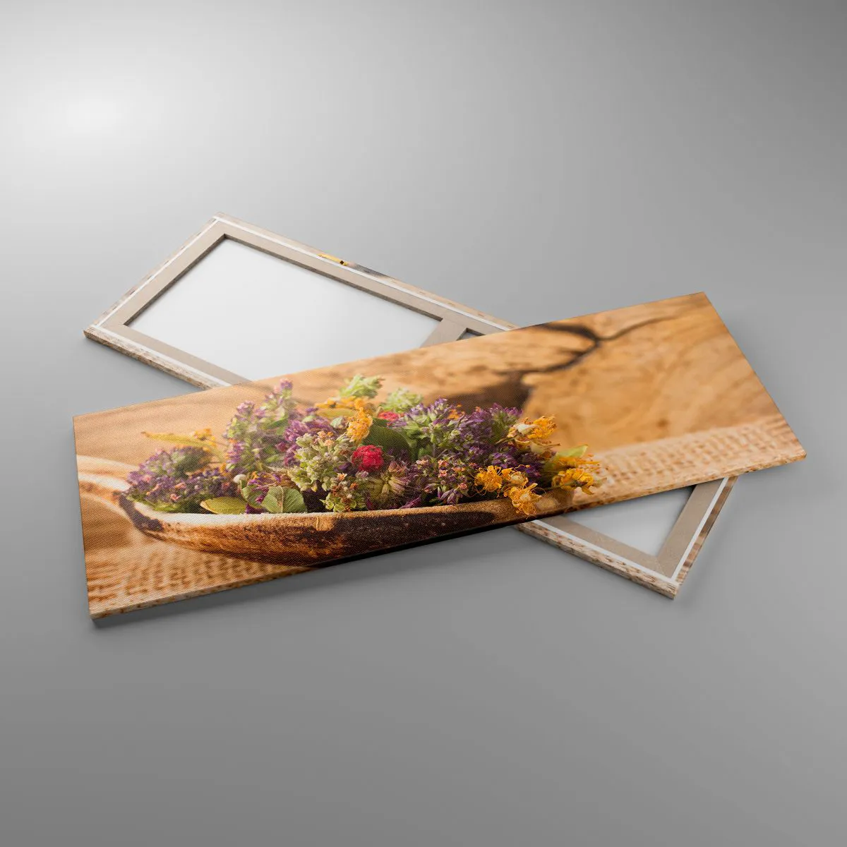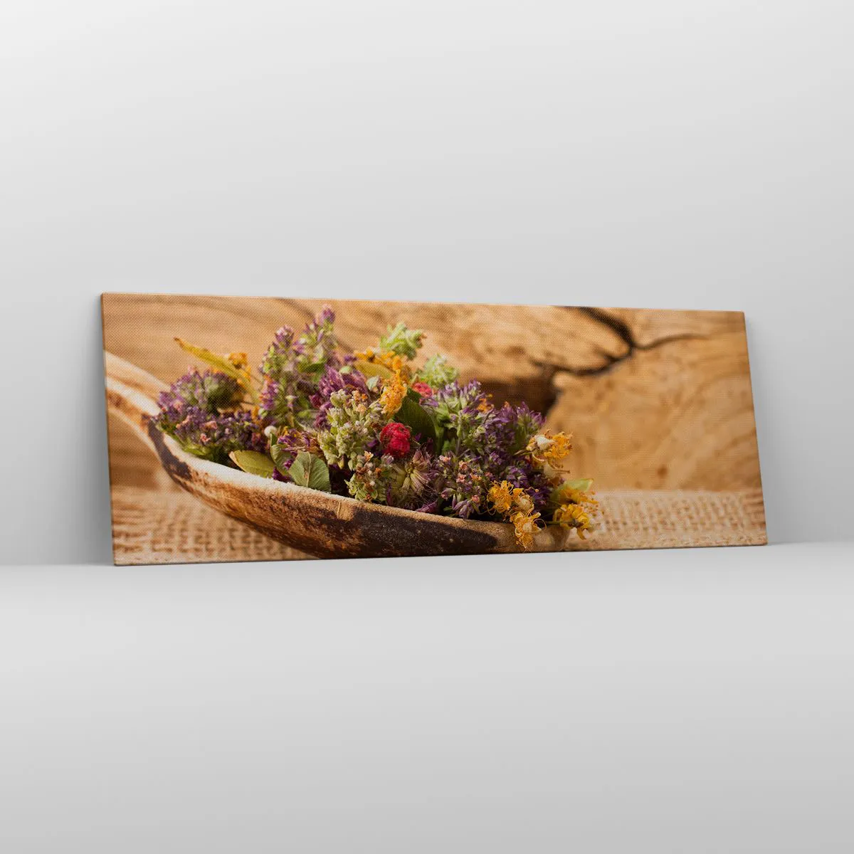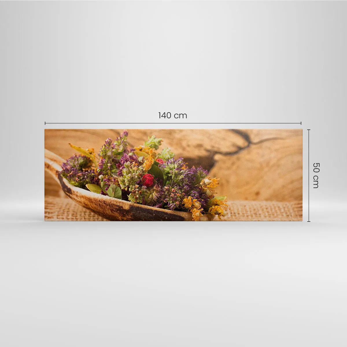 Impression sur toile - Image sur toile - Herbes séchées dans une cuillère en bois sur un fond en bois naturel - 140x50cm - Fleurs colorées et herbes parfumées - Décoration murale moderne pour le salon et la chambre ARTTOR