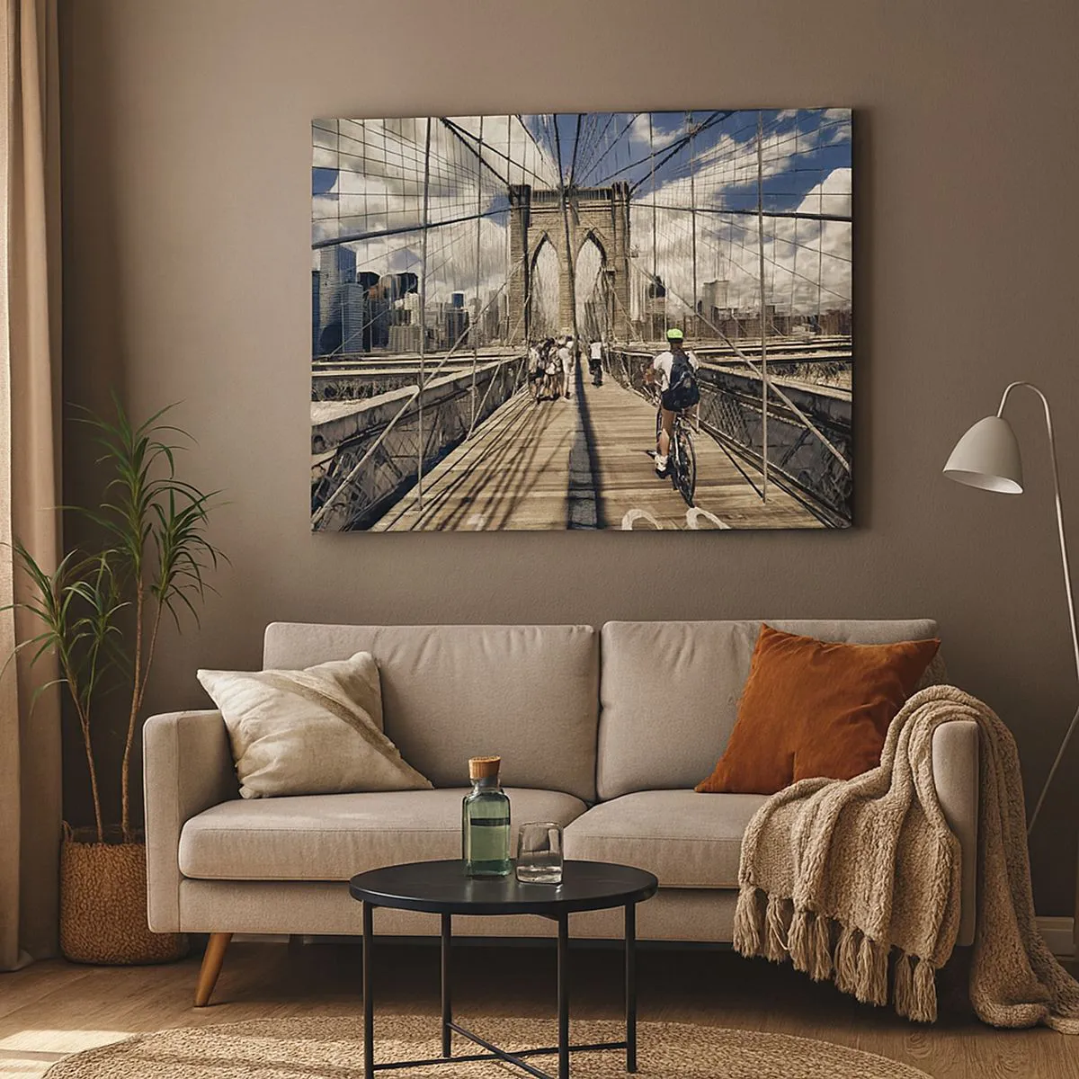 - Le tableau représente le pont de Brooklyn à New York, avec ses piétons et ses cyclistes traversant sa passerelle en bois. L'arrière-plan est peuplé de gratte-ciels et d'un ciel pittoresque parsemé de nuages.