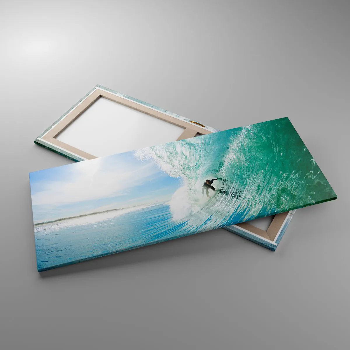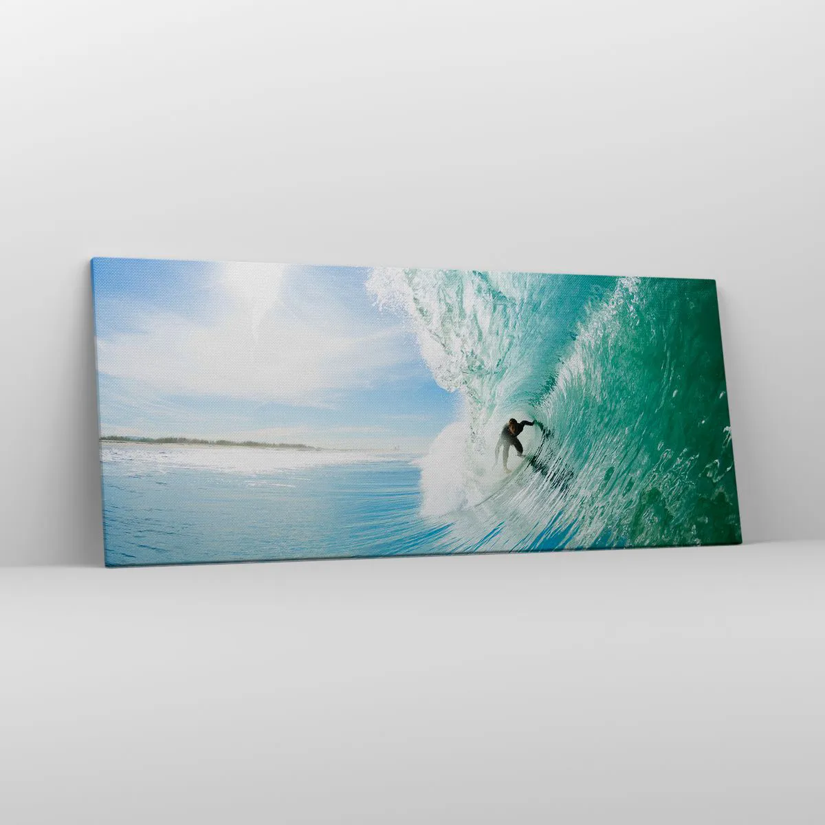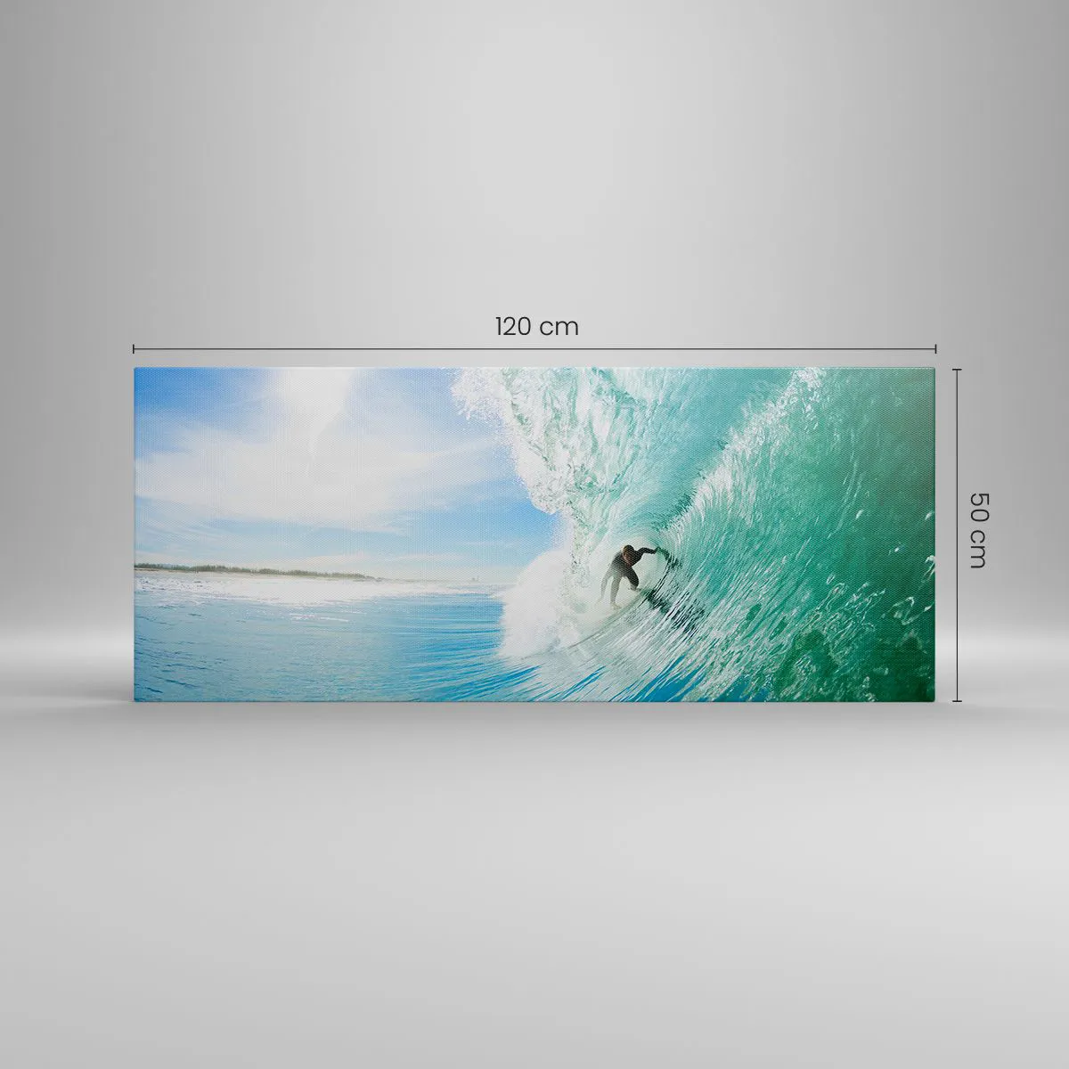 Impression sur toile - Image sur toile - Un surfeur chevauchant une vague au soleil contre un ciel bleu - 120x50cm - Toujours sur la vague - Décoration murale moderne pour le salon et la chambre ARTTOR