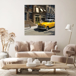 L'impression sur toile intitulée « Il était une fois en Amérique » représente un taxi jaune garé dans une rue bordée d'immeubles élégants, créant une vue urbaine unique. Cette combinaison d'automobile classique et d'architecture historique attire le regard et évoque la nostalgie.