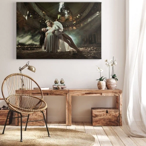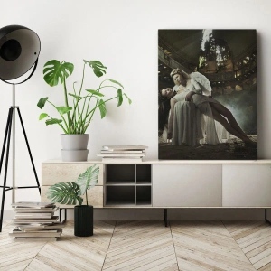 - Ce tableau représente deux personnages dans un décor mystique de ruines abandonnées. Le symbolisme angélique et les jeux d'ombres et de lumière créent une atmosphère mystérieuse et dramatique. Idéal pour les intérieurs aux accents gothiques et mystiques.
