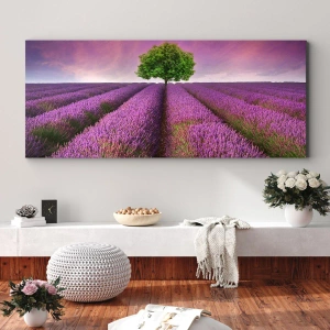 - Le tableau représente un champ de lavande pittoresque avec un arbre solitaire sur fond de ciel violet. Les couleurs chaudes et le paysage paisible apportent une touche d'harmonie aux intérieurs inspirés par la nature.