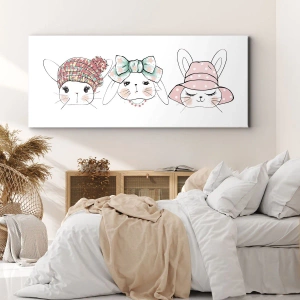 Impression sur toile - Image sur toile - Adorables lapins portant des coiffes pastel - 140x50cm - Pensif, triste, satisfait - Décoration murale moderne pour le salon et la chambre ARTTOR
