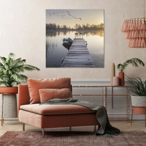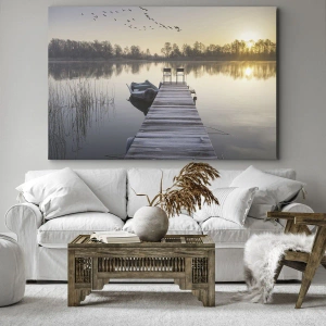 Le soleil levant illumine la surface de l'eau, créant des reflets lumineux et apportant de la chaleur à la fraîcheur matinale. Les couleurs naturelles du lac et de la nature environnante se marient parfaitement avec le motif minimaliste de la jetée, créant une harmonie qui captive par sa paix et sa simplicité. Ce tableau capture parfaitement la beauté d'une matinée au bord du lac, insufflant un sentiment de paix et de détente.