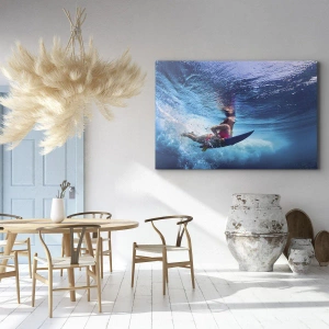 - Un tableau dynamique représentant un surfeur sous l'eau, entouré de vagues bleues. Une scène pleine d'énergie et d'harmonie, parfaite pour les intérieurs modernes.