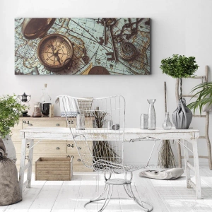 - Ce tableau de style rétro représente une boussole, des clés et une vieille carte. C'est la décoration idéale pour les passionnés d'aventure et de voyages.