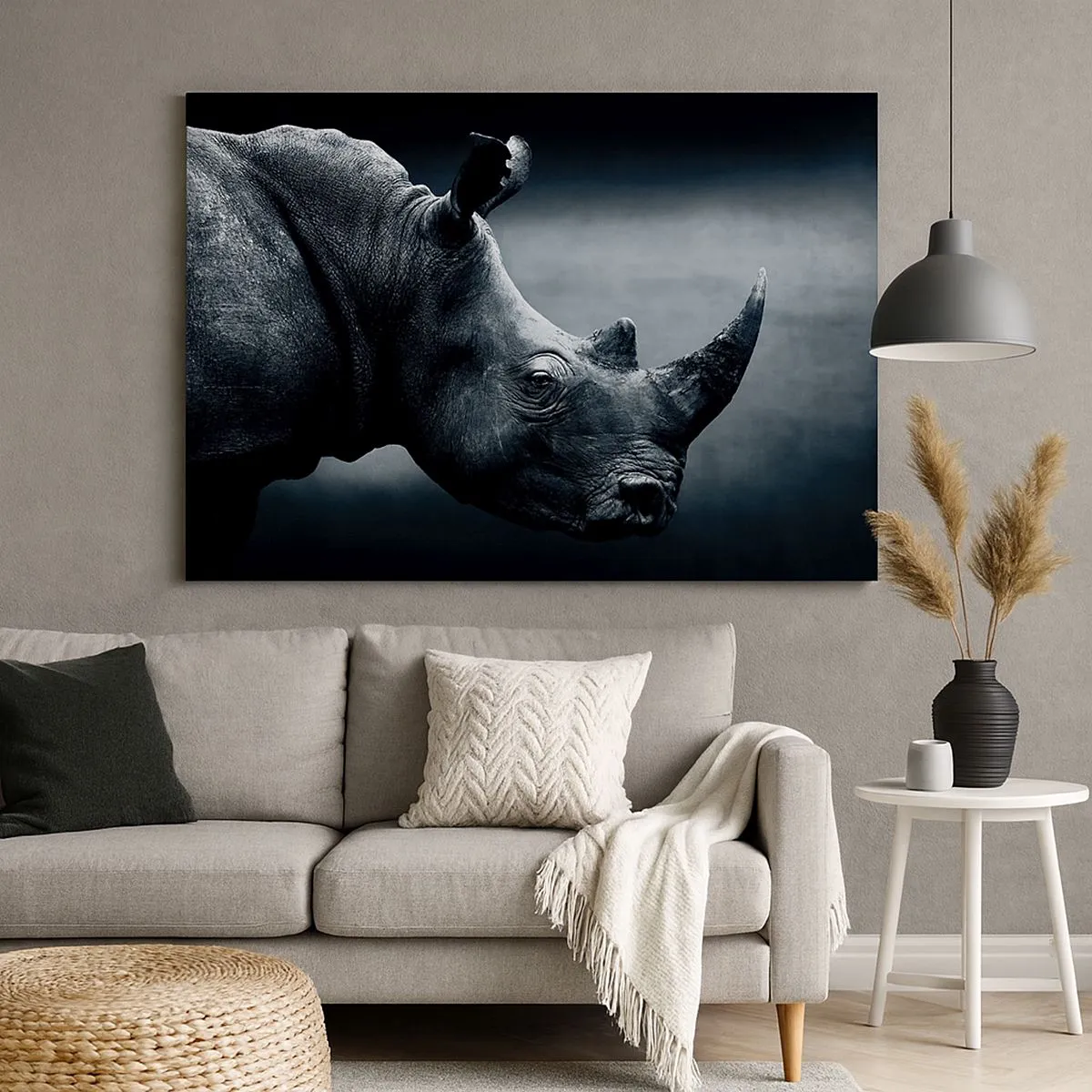 Impression sur toile - Image sur toile - Portrait noir et blanc d'un rhinocéros sur fond sombre - 100x70cm - Le profil droit - Décoration murale moderne pour le salon et la chambre ARTTOR