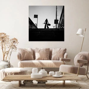 Impression sur toile - Image sur toile - Une figure de femme dans les escaliers en noir et blanc avec une atmosphère dynamique - 120x80cm - Pèlerinage urbain - Décoration murale moderne pour le salon et la chambre ARTTOR