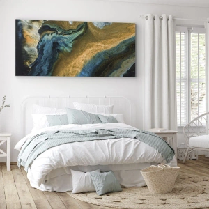 Impression sur toile - Image sur toile - Vagues abstraites dans des tons d'or et de bleu - 120x50cm - Bleu - jaune - influences mutuelles - Décoration murale moderne pour le salon et la chambre ARTTOR