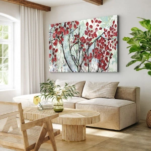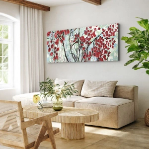 Grâce à ses dimensions et à son format horizontal, ce tableau s'adapte facilement à différents espaces. La finition de haute qualité et les matériaux durables garantissent des couleurs intenses qui conserveront leur fraîcheur pendant des années. Les feuilles rouges sur fond de ciel lumineux symbolisent l'harmonie et la légèreté, faisant de ce tableau un choix idéal pour ceux qui apprécient la paix et la beauté de la nature.