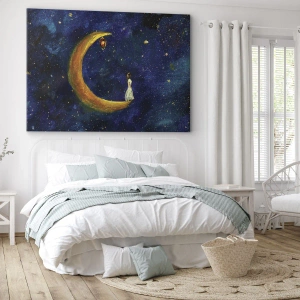 Impression sur toile - Image sur toile - Une fille debout sur la lune dans un ciel étoilé - 100x70cm - Appel du monde - Décoration murale moderne pour le salon et la chambre ARTTOR