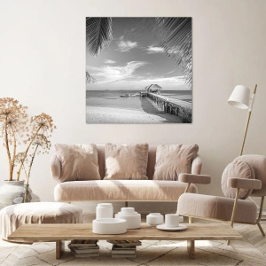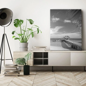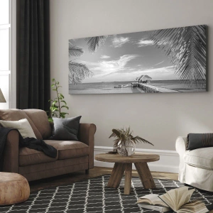Impression sur toile - Image sur toile - Plage noire et blanche avec jetée et palmiers sur une côte tropicale - 140x50cm - Souvenirs ou rêve? - Décoration murale moderne pour le salon et la chambre ARTTOR