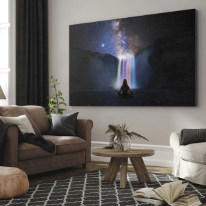 - Cette toile représente une personne méditant devant une cascade, entourée d'un ciel étoilé. Idéale pour un intérieur relaxant.