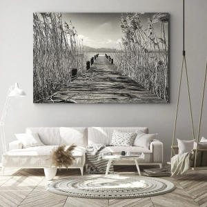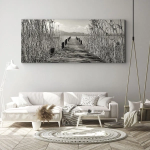 Impression sur toile - Image sur toile - Une jetée en bois parmi les hautes herbes au-dessus d'un lac aux tons sépia - 140x50cm - Dans le calme de l'herbe - Décoration murale moderne pour le salon et la chambre ARTTOR