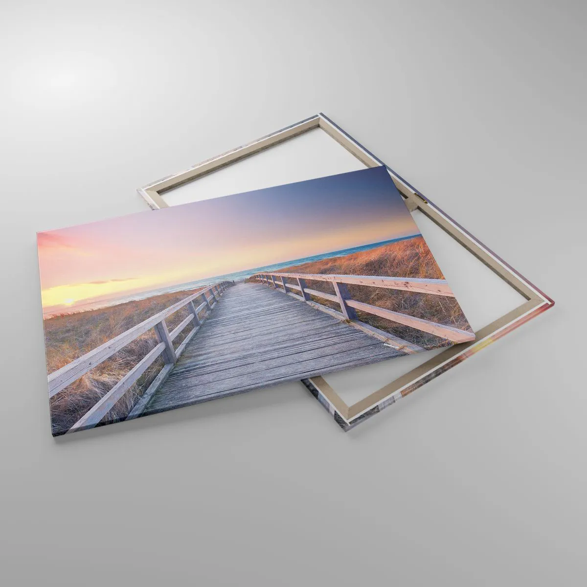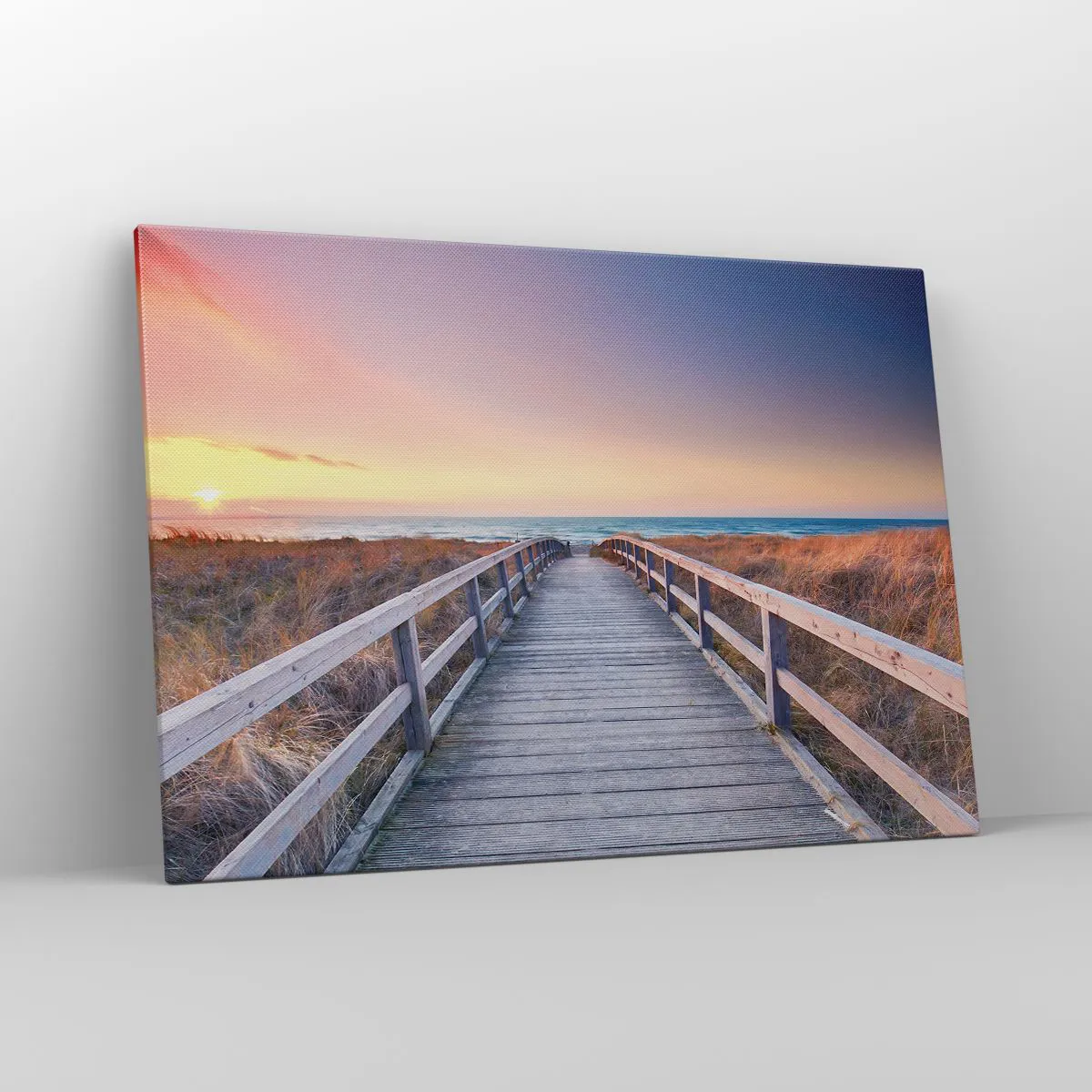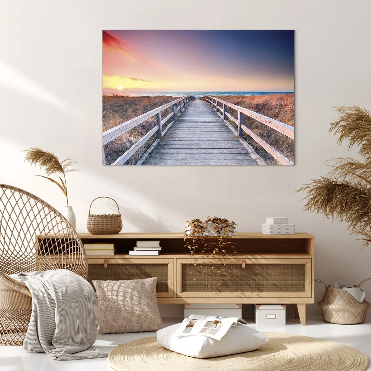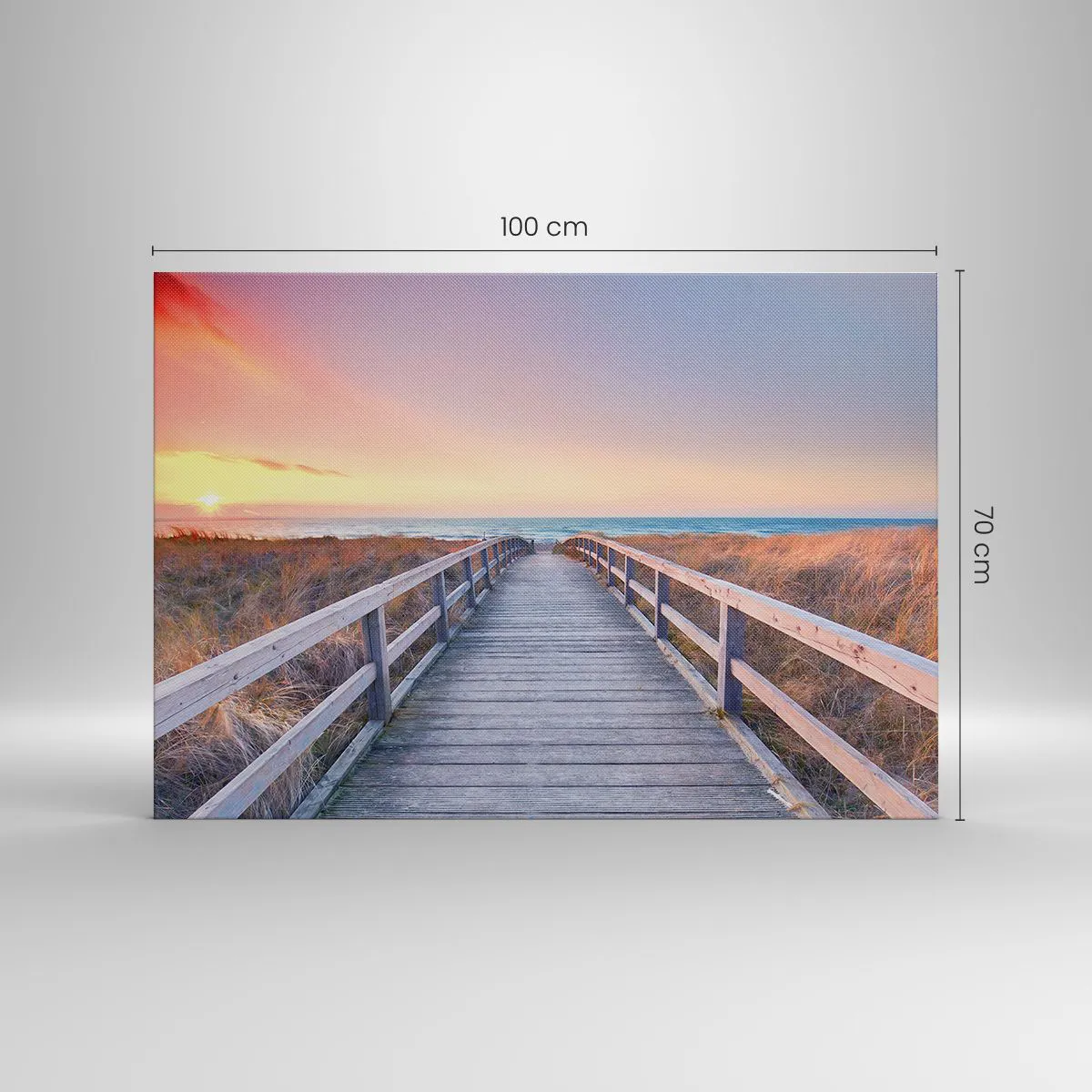 Impression sur toile - Image sur toile - Une jetée en bois menant à la plage au coucher du soleil avec le ciel peint de couleurs pastel. - 100x70cm - Aurore baltique du soir - Décoration murale moderne pour le salon et la chambre ARTTOR