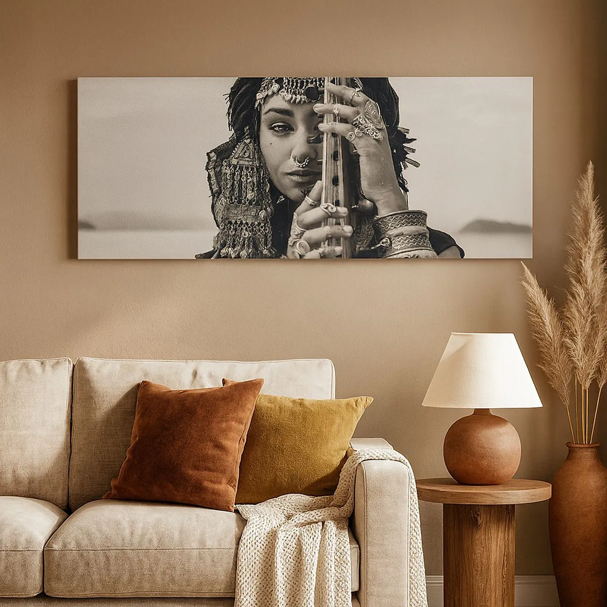 Impression sur toile - Image sur toile - Portrait d'une femme en bijoux ethniques tenant un instrument à la main - 140x50cm - Musique de l'Orient elle-même - Décoration murale moderne pour le salon et la chambre ARTTOR