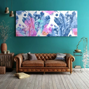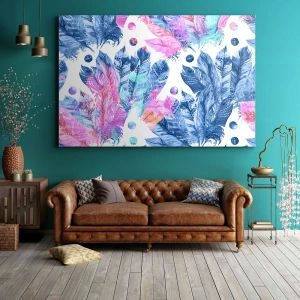 - Ce tableau présente un motif abstrait de plumes colorées aux tons pastel. Il s'intègre parfaitement à tout intérieur nécessitant une touche artistique subtile. Dimensions : 70 x 50 cm.