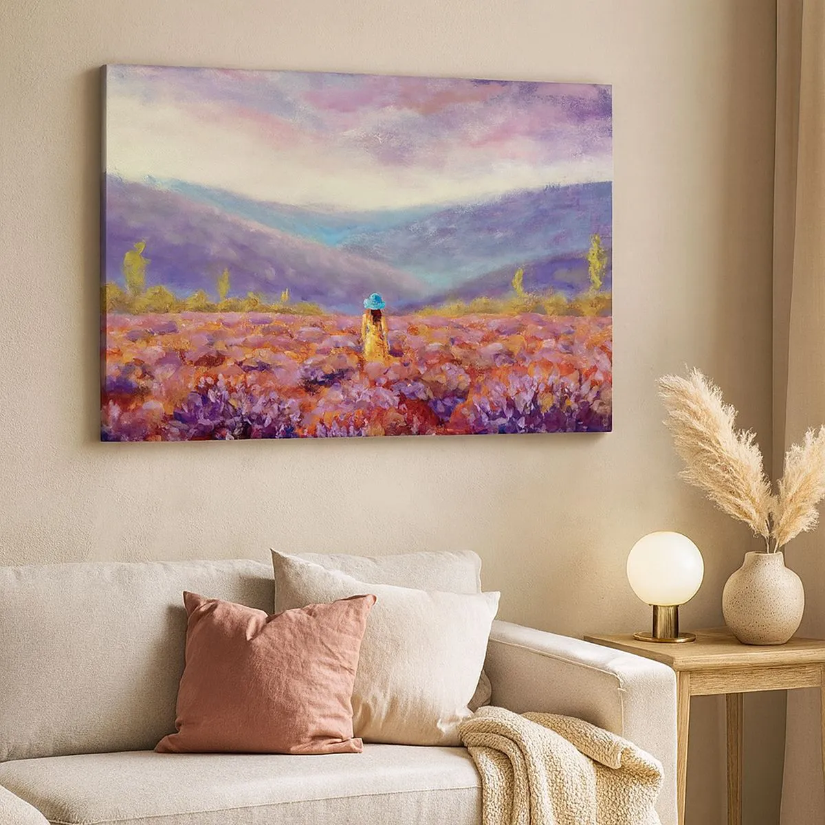 Impression sur toile - Image sur toile - Une femme portant un chapeau marchant dans un champ de lavande. - 120x80cm - Dans un monde lavande - Décoration murale moderne pour le salon et la chambre ARTTOR