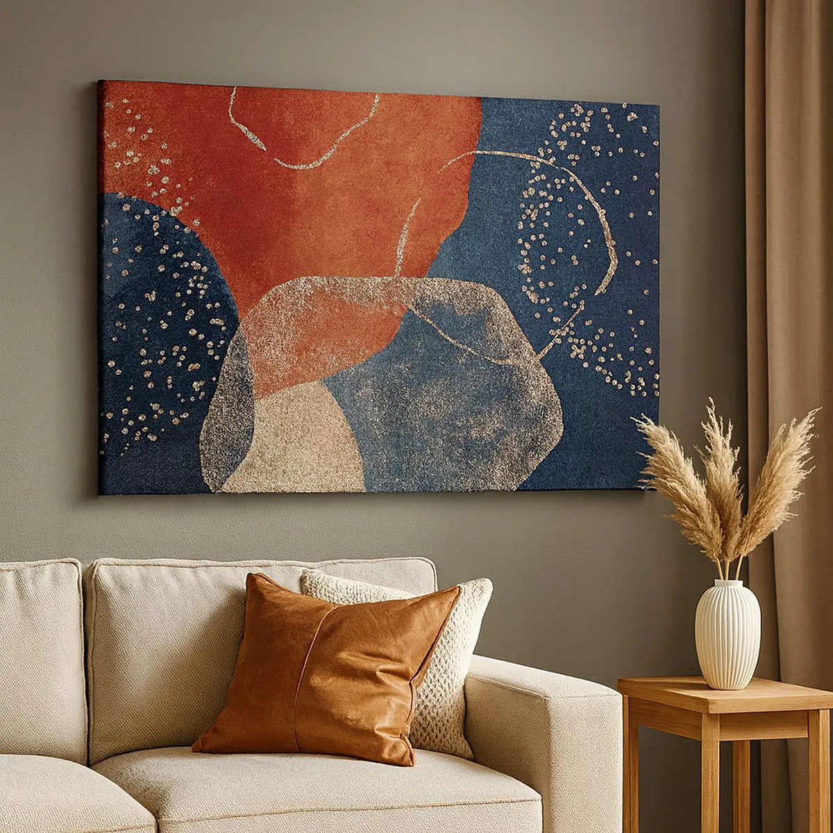 - Un tableau moderne aux formes abstraites aux tons rouges, bleus et dorés. Son élégance et son minimalisme apportent harmonie et style à votre intérieur. Un choix idéal pour les espaces modernes.
