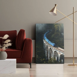 Impression sur toile - Image sur toile - Un train bleu sur un viaduc historique au milieu des forêts - 120x80cm - Train nature - Décoration murale moderne pour le salon et la chambre ARTTOR