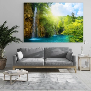 Impression sur verre - Image sur verre - Une cascade se jetant dans un lac turquoise entouré de verdure - 80x120cm - Ce doit être le paradis ici - Décoration murale moderne pour le salon et la chambre ARTTOR