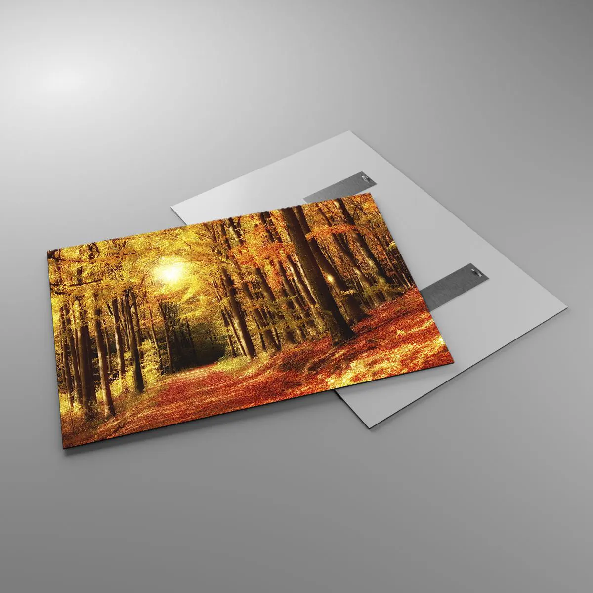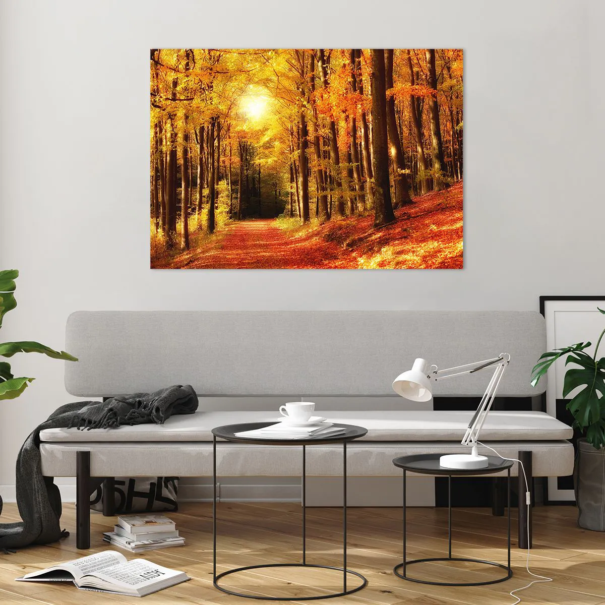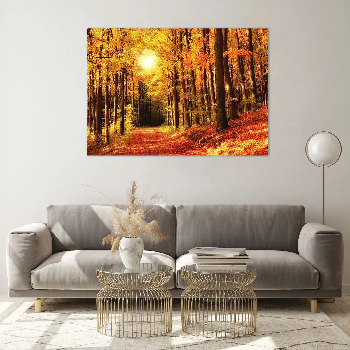Impression sur verre - Image sur verre - Forêt d'automne baignée de soleil doré - 100x70cm - Automne doré sur une route forestière - Décoration murale moderne pour le salon et la chambre ARTTOR